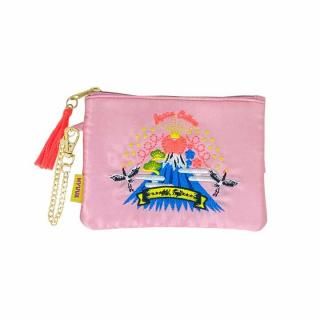 明るいピンクカラーのサテン生地をベースに、富士山、鶴、松の縁起の良いモチーフをすべて刺繍で表現したポーチ。