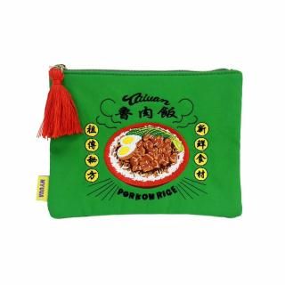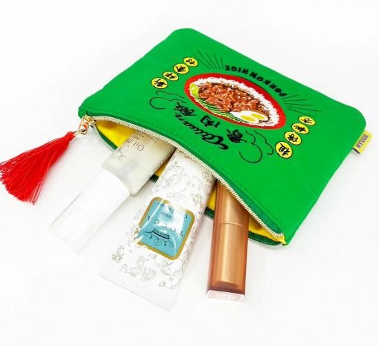 台湾のローカル飯といえばルーローハン!日本でも人気の料理ですよね。 ルーローハンの米粒一つ一つまで刺繍で表現し、タレがお米に染み込んでいる状態も再現しました。てりってりな肉の艶も表現。 鮮やなグリーンの生地に赤いタッセルがポイント。 バッグに入れて持ち歩くのにちょうど良いサイズ感です。